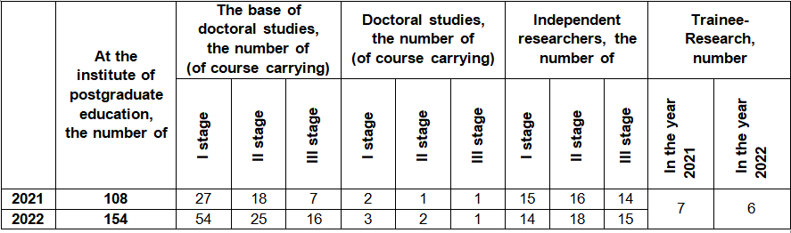 2022 yilda jami 67 nafari, shundan 3 nafari doktorantura (DSc) va 54 nafari tayanch doktorantura, 10 nafari mustaqil izlanuvchilik hamda 6 nafari stajyor-tadqiqotchilik institutiga qabul qilingan.