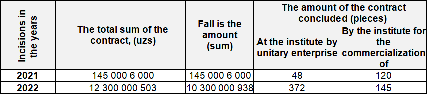Joriy yilda ilmiy-tadqiqot va amaliy, hamkorlik va xo‘jalik shartnomalaridan umumiy qiymati 13 942 075 000 so‘mlik loyihalar amalga oshirilmoqda.